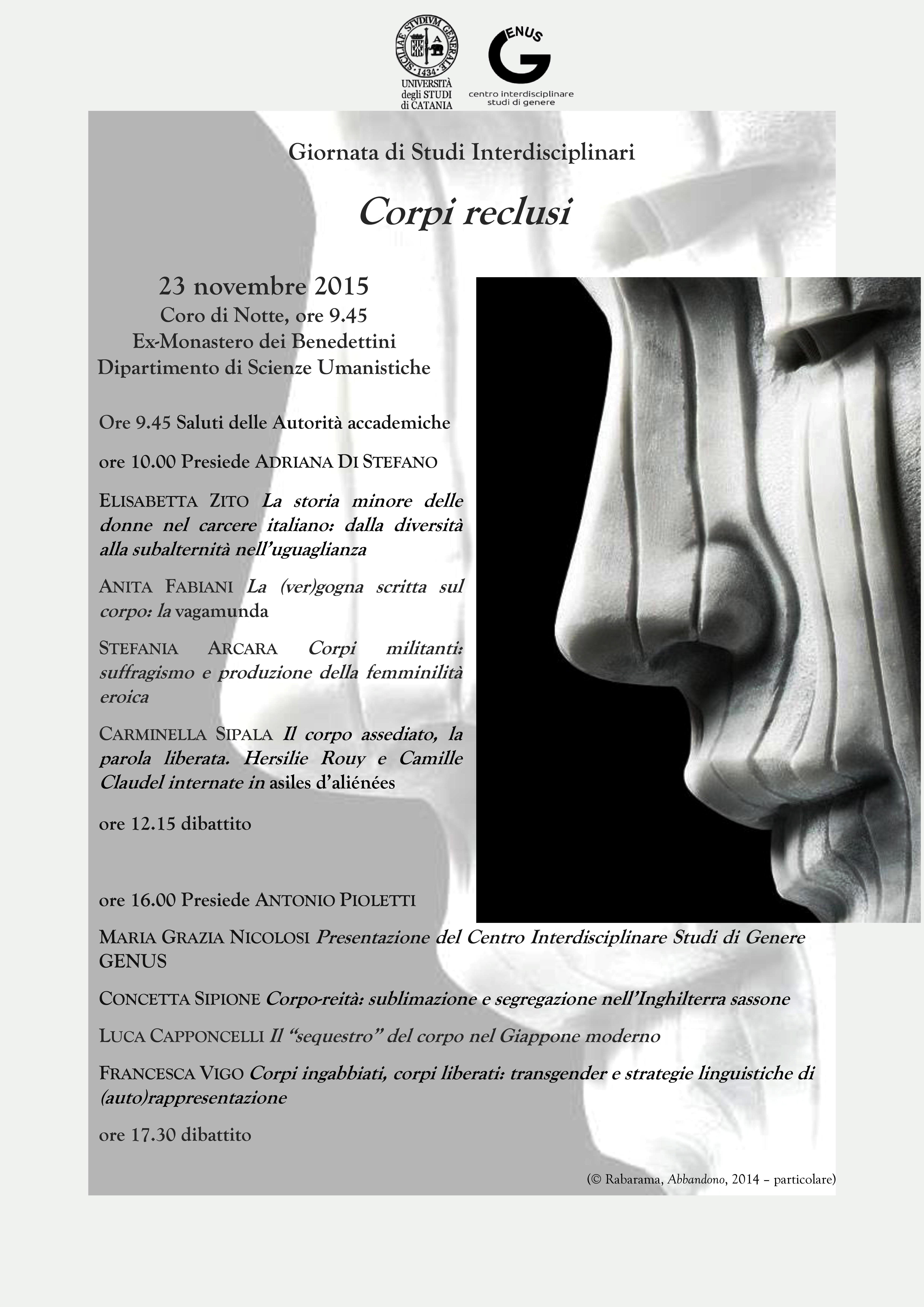 Il 23 novembre 2015 si terrà la Giornata di Studi Interdisciplinari "Corpi reclusi" presso il Coro di Notte, Ex-Monastero dei Benedettini, Dipartimento di Scienze Umanistiche.